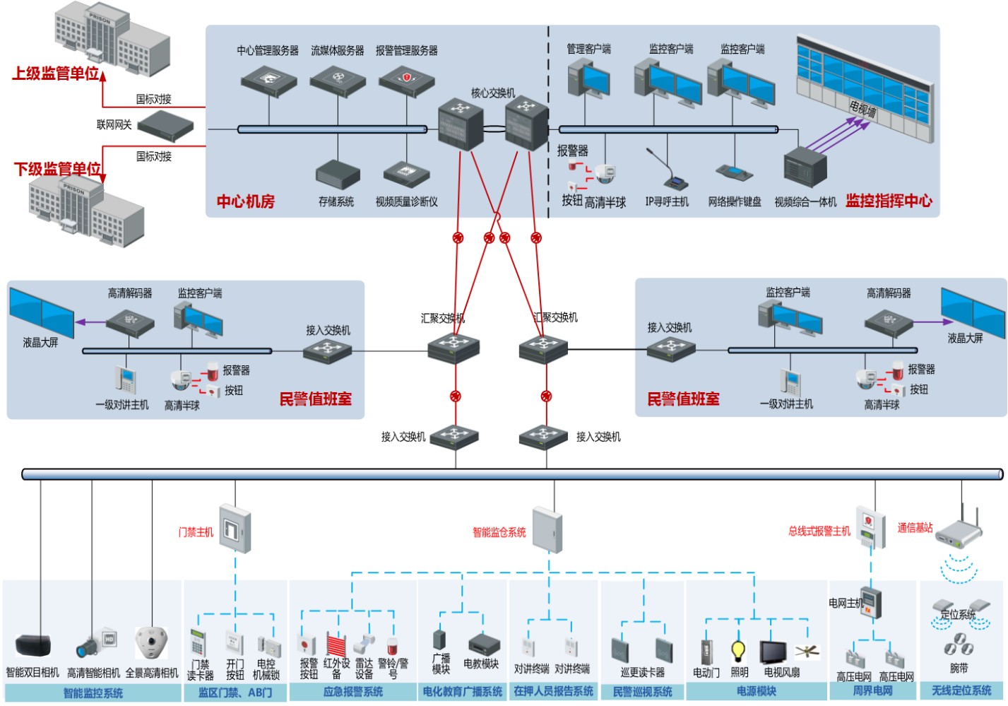 智(zhì)慧型平安監所係統集成拓撲結構,如下圖所(suǒ)示: